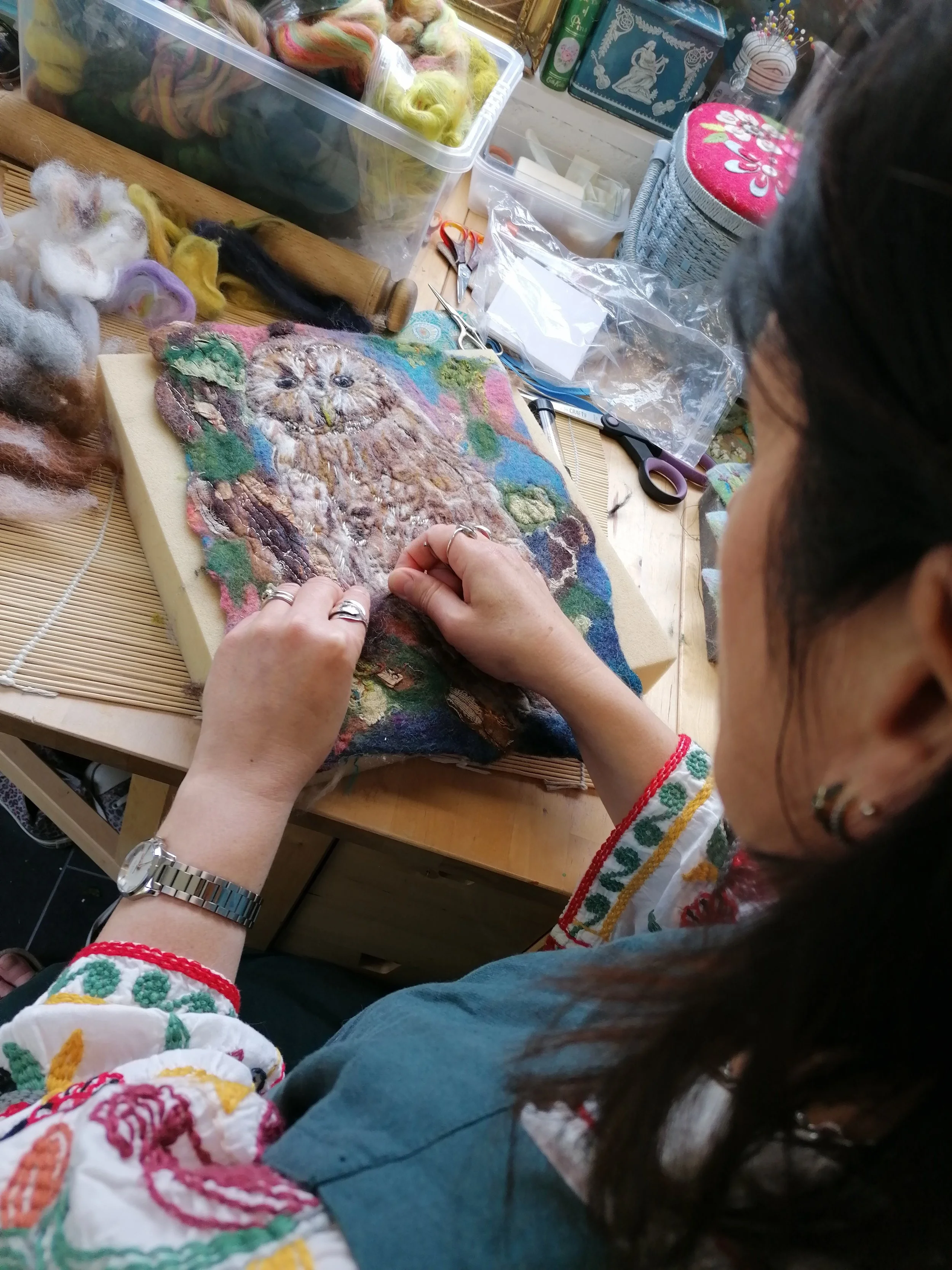Needle felting is another way of creating felt. Small pieces of wool are jabbed with a barbed needle into the felted background. This adds more depth to the image, creating highlights and shadow, depth and tone.
